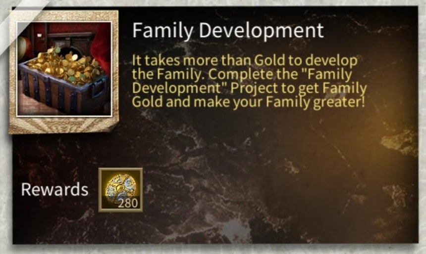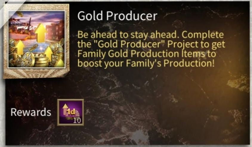 • Daily tasks can give a family gold production boost, which can double production speed for 24 hours. (Gold Producer task)